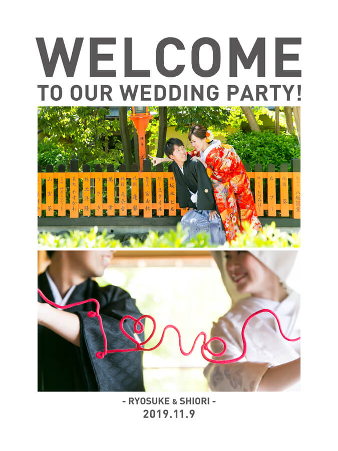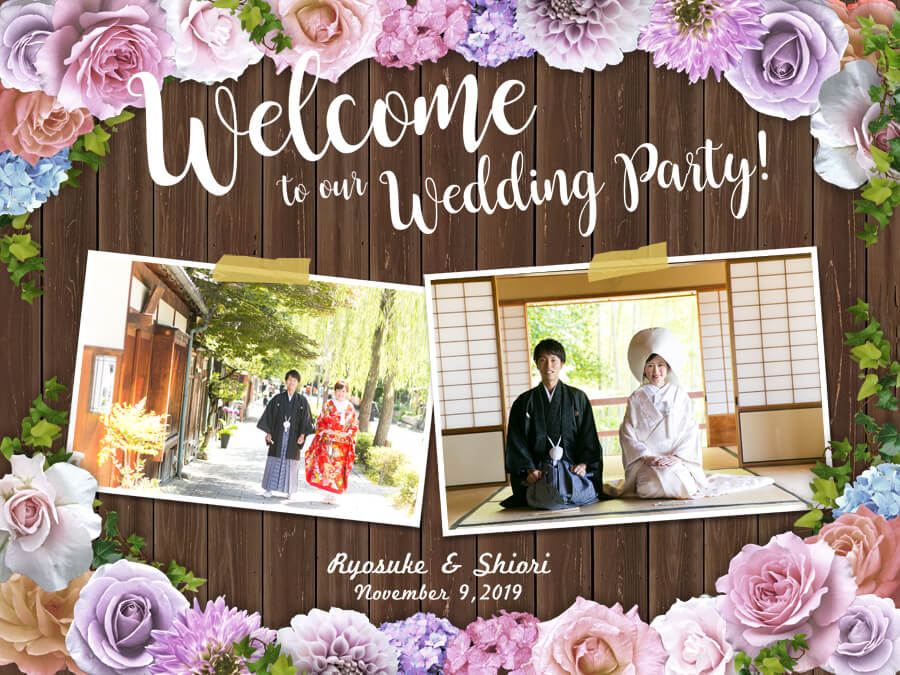 前撮りのお写真の等、お二人のお写真を使い、結婚式当日に飾って頂ける「A3サイズ」のウェルカムボードを制作いたします(ウェルカムボードのタイプは3タイプからお選びいただけます)。
